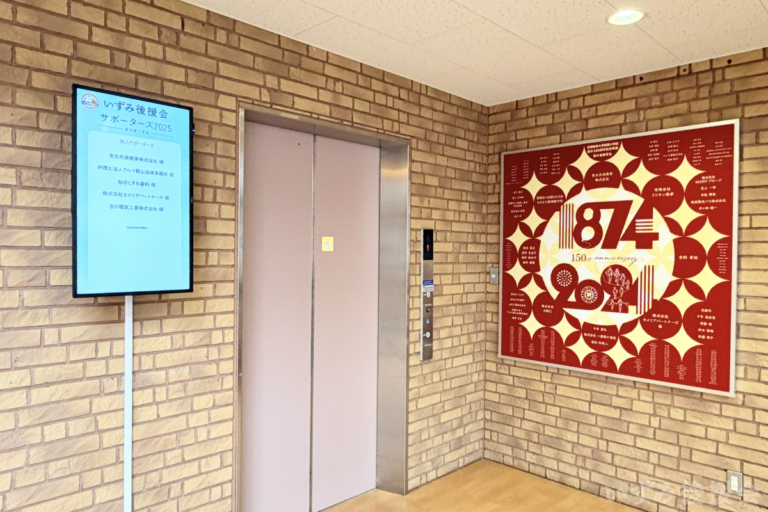 TOPICS いずみ後援会デジタルサイネージ設置 2026.02.27 お知らせ 職員玄関のエレベーター脇に、いずみ後援会のデジタルサイネージを設置いたしました。本日より、「サポーターズリスト2025(2025年度寄付者御芳名)」をスライドショー形式で表示しております。 あらためまして、平素より附属小の取組みにご理解とご協力を賜り、ご寄付をお寄せくださった皆さまに心より感謝申し上げます。 ご来校の際はぜひお立寄りいただきご覧いただければと存じます。今後とも温かいご支援を賜りますよう何卒よろしくお願い申し上げます。 関連リンク教育の未来を応援する—— 子供たちを育む土壌を共につくりませんか?体育館大型スクリーン新調・設置完了のご報告
